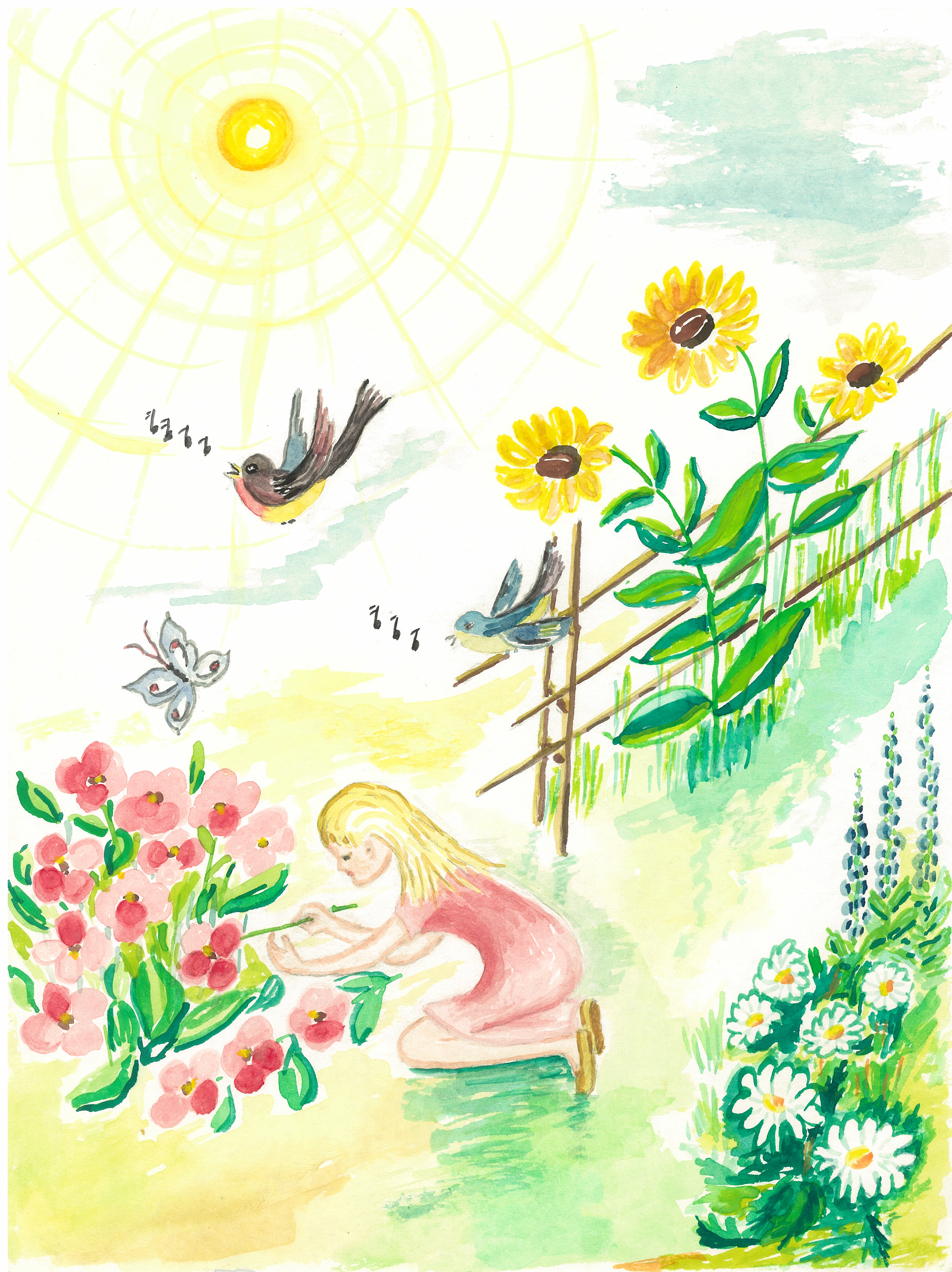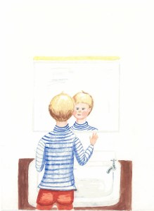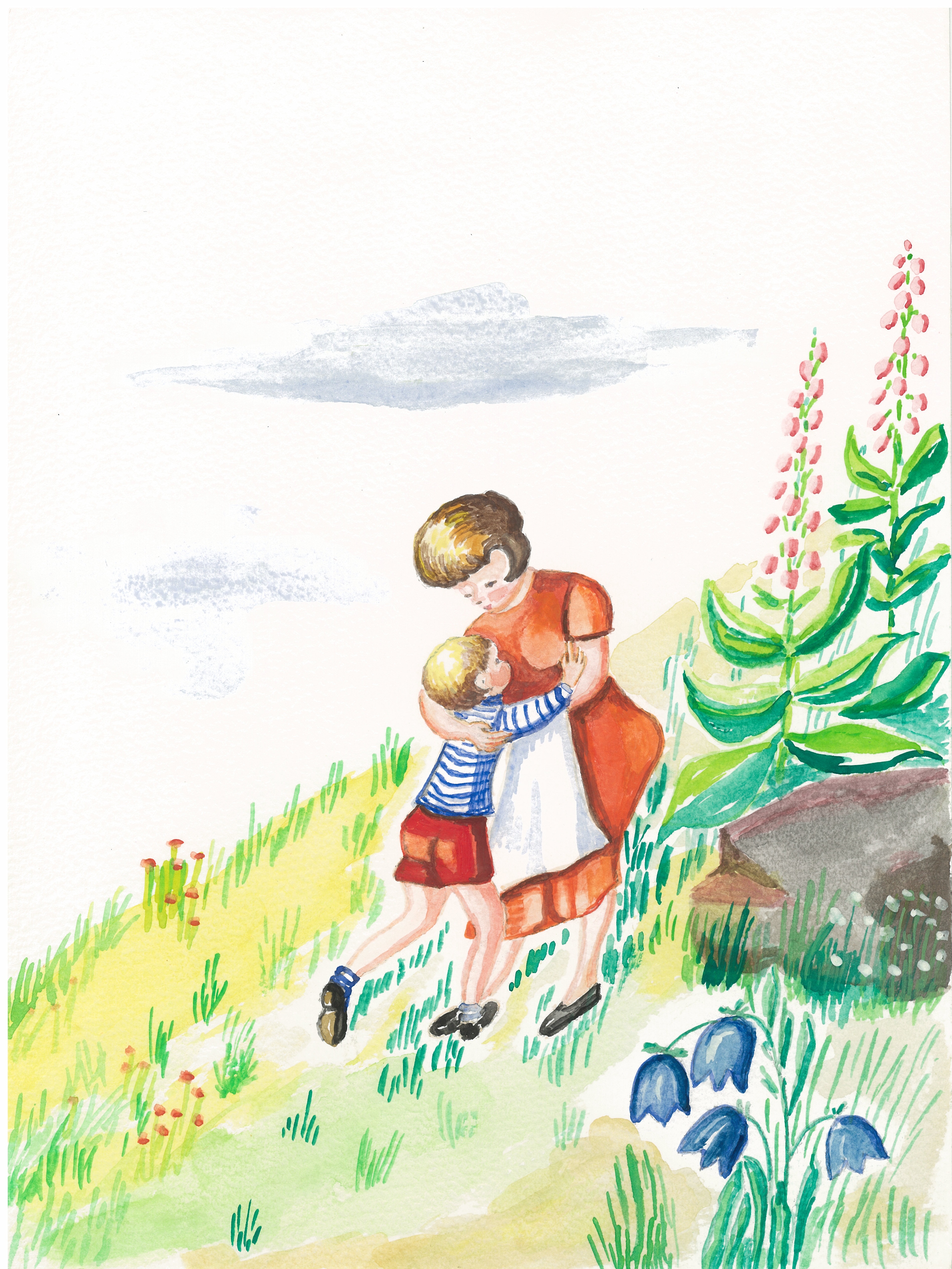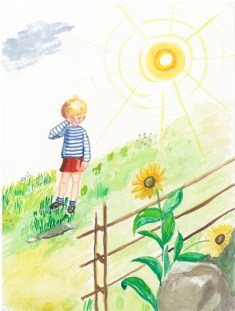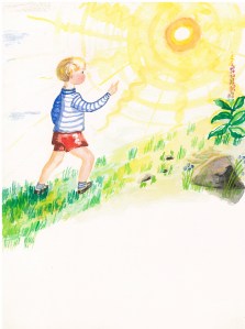 Denne lille barneboken ble laget på slutten av 70 tallet. Kunstneren, Gerd Tjøstland, har illustrert den med sine magiske akvareller. Her , i forminsket format, kan man få et lite inntrykk av den.
