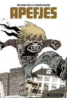 Vi ser for oss omslaget : Tittelen Apefjes og tegningen av gutten som springer rundt i storbyen med apemaske.
